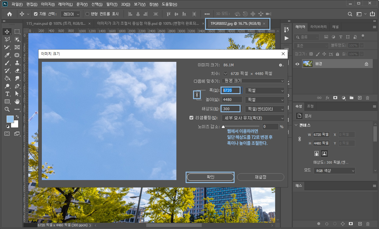 웹에서 이용하려면 해상도를 72로 먼저 변경한 후 폭의 숫자를 입렵하는 것이 좋다. (인쇄일 때 해상도 300)