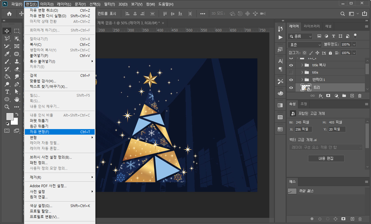 1. 편집(Edit) > 지유변형(Free Transform), 단축키 ctrl+t 눌러 준다.
