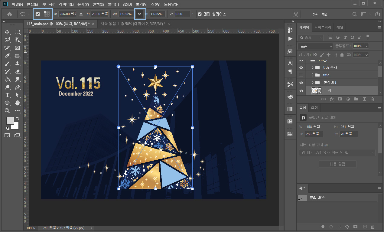 2. 반드시 폭(W) 높이(H) 링크 모양이 선택 되어 있는지 확인할 것!!(같은 비율로 조절 하려면 반드시 선택되어 있어야 함)