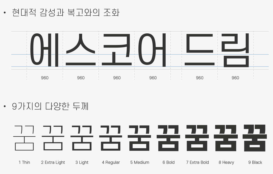 에스코어 드림은 ‘Dream(꿈)’과 ‘드리다’라는 두 가지 뜻을 가지고 있으며, 꽉 찬 직사각형 구조의 제목용 글꼴로써 복고적인 형태에 현대적인 감성을 담았다고 합니다.